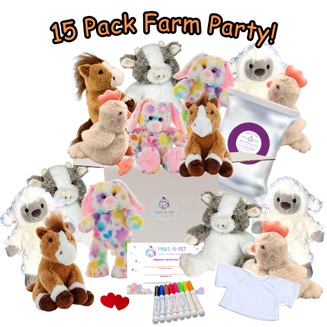 Our Farm Fifteen Pack Party Fuzzy Kit for stuff your own animal comes with the following (T-Shirts optional pull down):